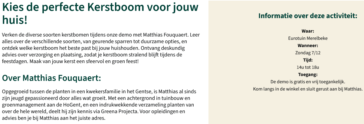 Tijdens deze demo kan je al je vragen stellen aan onze plantenexpert zodat je de tips en het advies ook makkelijk zelf kan toepassen. Afhankelijk van de periode in het jaar zal de demo over een ander onderwerp gaan. Zo ben je altijd mee met de laatste trends.